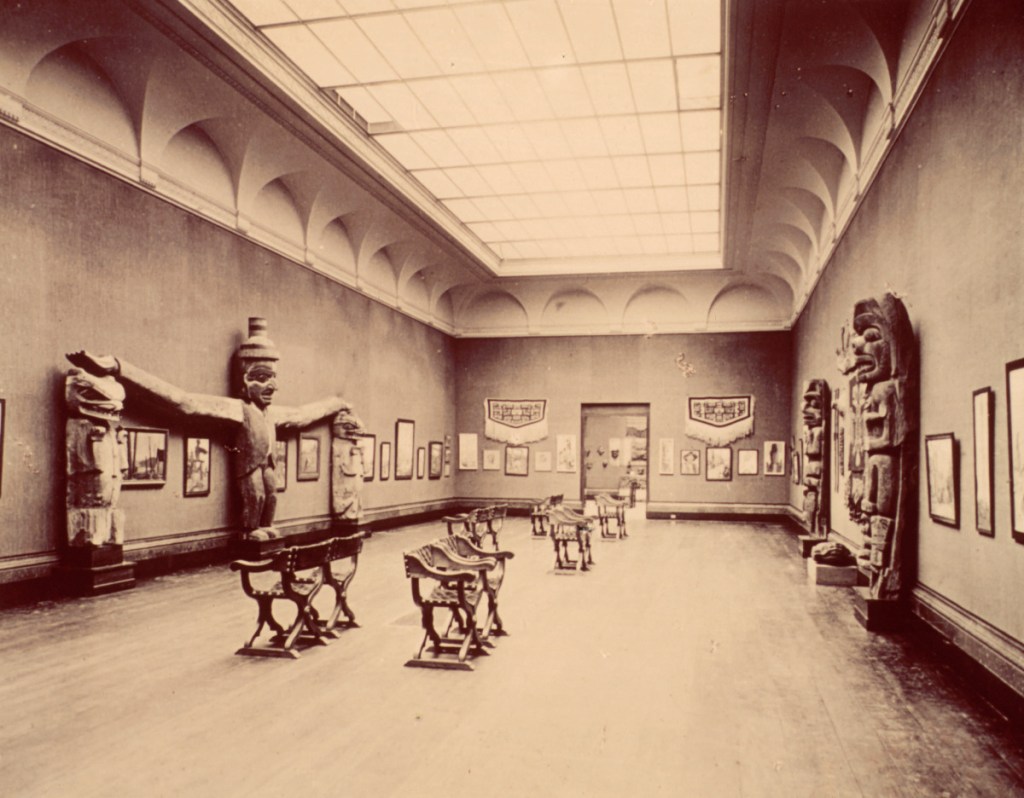 Cette exposition marquante eut lieu au Musée des Beaux-Art d’Ottawa en 1927 et à la Galerie d’art de Toronto en 1928. Comme on le voit ci-dessus, la mise en valeur des oeuvres est sobre, une juxtaposition de tableaux d’artistes canadiens et d’objets de la culture autochtone de la Côte Nord-Ouest. On peut se demander qu’est-ce qui était le plus mis en valeur: les oeuvres des artistes canadiens ayant voyagé sur la Côte Nord-Ouest ou les oeuvres autochtones proprement dites? Le titre qualifie ce qui est présenté d’un épithète unique – Art canadien de la Côte Ouest, mais le sous-titre dépasse un peu du jupon comme on dit parfois, en opposant le caractère autochtone au caractère moderne (native and modern), volontairement ou non. Est-ce dans un élan soudain de sympathie, digne du paradigme de sauvetage dont il a été question plus haut, qu’on associe dans une exposition nationale l’art autochtone à l’art canadien? Est-ce dans la même lignée que l’assimilation des enfants autochtones dans les pensionnats dès le milieu des années 1800 pour qu’ils deviennent de petits canadiens? L’exposition d’Ottawa en 1927 coïncide également avec le 60ème anniversaire de la Confédération, à une époque où l’identité canadienne tente de se raffermir. Ce jubilé de diamant est un des premiers événements majeurs de la fête du Dominion parrainés par le gouvernement fédéral. Mais tous ne sont pas de la même opinion.