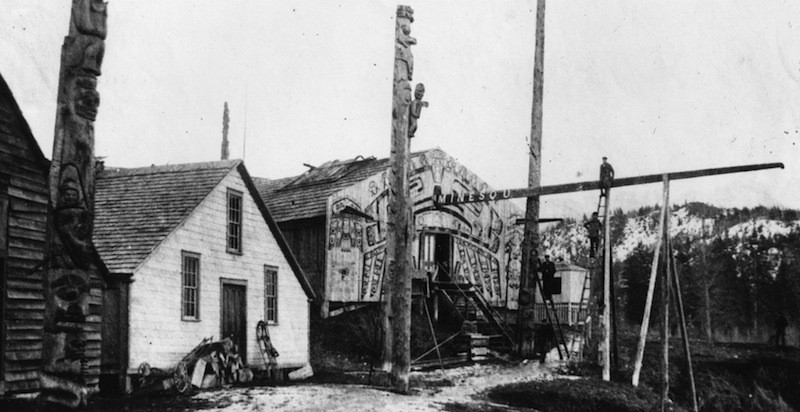Ces maisons en rangée faisant face à la rivière, il faut savoir que cette dernière maison où se retrouve le mât serait celle du chef du clan de l’Aigle, cependant il n’y a pas de photographie d’archive connue qui présente la façade de cette maison avec le mât derrière. Cependant, la maison du chef pourrait comporter une peinture de façade, un paravent orné, comme on en voit typiquement dans l’architecture Tsimshian, par exemple. La photographie ci-dessous illustre une rangée de maisons à Gitlaxdams – sur la rivière Nass également. La dernière maison comporte un tel paravent, qui est un panneau supplémentaire apposé en façade, est un bon exemple.