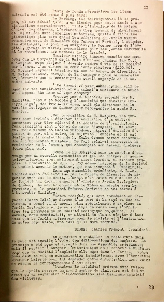 Dans une assemblée précédente, M. L.-A. Richard avait été autorisé par le bureau de la direction de négocier avec qui de droit, l’achat d’un Totem Pole au nom de la Société qui devait ensuite l’offrir au Jardin Zoologique de Québec. Le marché conclu et le Totem en marche vers la province, M. le président Frémont écrivait en ces termes à l’honorable Ministre :