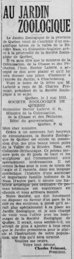 Dans l’article « Au Jardin zoologique », publié par Le Soleil, on annonce le don du mât au Jardin. Cette lettre expose bien les motifs de la Société zoologique; on sait que le totem s’en vient.