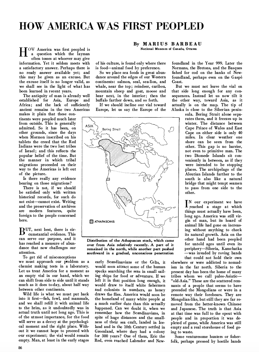 Le reportage D’où vinrent les sauvages du journal La Presse reprend une théorie élaborée par Barbeau dans son article « How America was Peopled », publié dans le Scientific American d’août 1932. Dans ces deux articles assez similaires, il fait part de sa conception de l’arrivée des autochtones en Amérique, en plus de l’arrivée des animaux. Il résume aussi les traits de la culture autochtone de la Côte Nord-Ouest. Ce qui étonne, à la lecture de ce long article publié dans un grand quotidien, c’est le niveau d’érudition de Barbeau. Non seulement s’est-il intéressé à la culture de la Côte Nord-Ouest, mais en plus, il brosse un portrait fascinant du peuplement de l’Amérique à travers les grandes migrations ayant eu lieu des milliers d’années auparavant et permettant de faire comprendre que les Premières Nations étaient là bien avant l’arrivée des civilisations européennes. C’était sa façon de justifier son admiration pour les pratiques artistiques des autochtones à l’autre bout du pays. Plus de quatre-vingt ans après cette publication et malgré l’évolution de nos connaissances sur le peuplement des Amériques, plusieurs de ses vues s’avèrent encore applicables dans leurs grandes lignes.