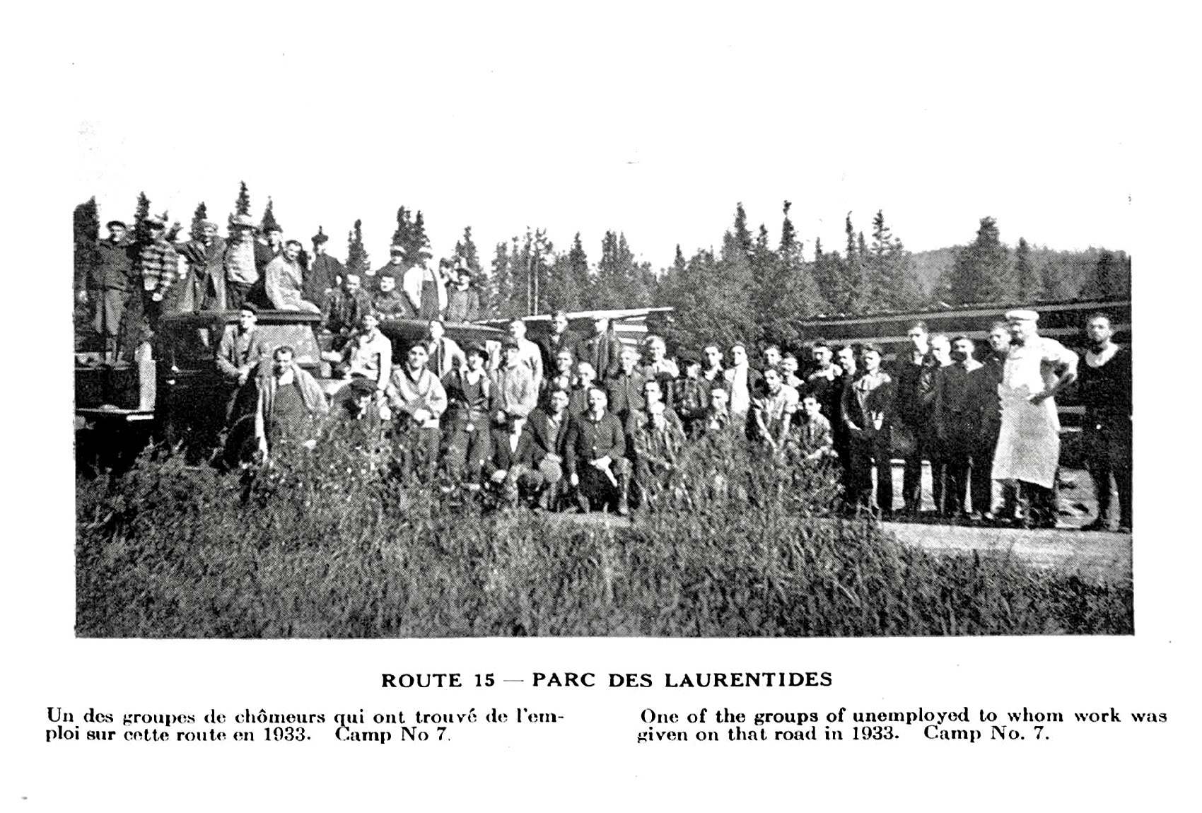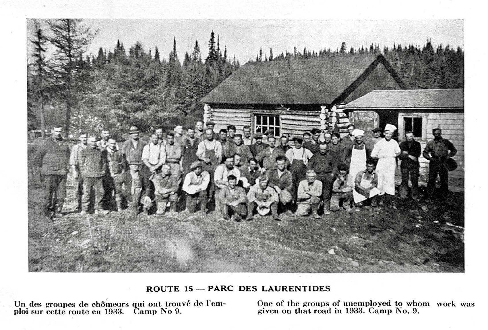 Simultanément, dans plusieurs camps du Parc National des Laurentides, le ministère de la Voirie emploie 600 hommes travaillant à la réfection de la route du Parc. Bref, ce trimestre se sera achevé sur un air de prospérité économique; on fait travailler des chômeurs, enfin, après ceux engagés sur la ferme expérimentale et le jardin.