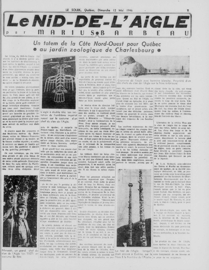 L’article Un Totem pour Québec de Marius Barbeau, en quatrième page du supplément soulignant l’ouverture du Jardin zoologique en raconte un peu plus, dont la légende fondatrice du peuple Nisga’a. Plus facile à lire en ligne, une version révisée été publiée dans Le Canada Français de décembre 1940.