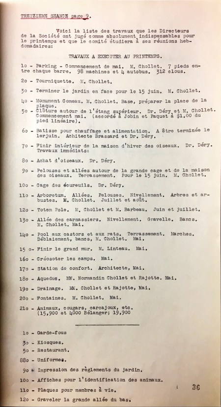 On dresse « la liste des travaux à exécuter que les Directeurs de la Société ont jugé comme indispensables pour le printemps et que le comité étudiera à ses réunions hebdomadaires ».