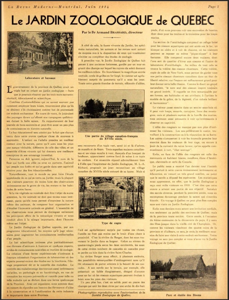 Montréal, avec son million d’habitants et plus, ne possède qu’un semblant de ménagerie. Tout comme un jardin botanique (celui de Montréal sera un jour, grâce au Frère Marie- Victorin, l’un des plus beaux du monde), une ville de l’importance de Montréal, métropole du Canada, deuxième ville française du monde, etc., se doit de posséder un jardin zoologique montrable.