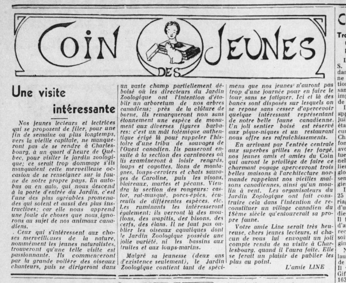 Dans L’Action catholique et Le Soleil du 10 octobre, on voit également que le Jardin zoologique attire de la grande visite, soit les participants et participantes au 2e le congrès de l’Association canadienne-française pour l’avancement des sciences. Comme on peut le constater dans les Annales de l’A.C.F.A.S, durant une séance publique, son directeur souligne l’encouragement reçu de plusieurs personnes pour l’organisation de la quatrième exposition régionale des Cercles des jeunes naturalistes à l’Académie commerciale, dont celle de Charles Frémont, président de la Société Zoologique.