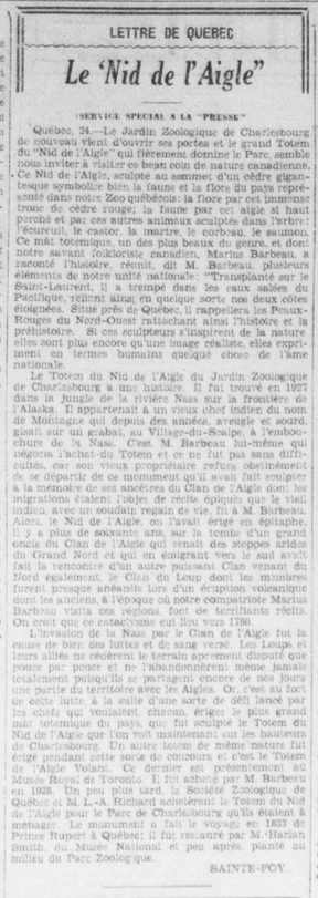 C’est ainsi que la rubrique « Lettre de Québec » de La Presse du 24 juin s’ouvre, on porte une grande estime au Nid de l’Aigle. C’est probablement la seule fois qu’on semble prêter au mât un trait de personnalité en le trouvant invitant, rien de moins! On souligne qu’il avait été élevé comme un épitaphe à la mémoire des ancêtres du clan de l’Aigle, sur la tombe d’un grand oncle du clan, sa création aurait été initiée par un défi que se lancèrent les chefs de sculpter le plus grand mât, suite à des combats. Même si ses blasons racontent une histoire, ce n’est pas nécessairement celle des migrations ni de la lutte entre les clans du nord et les clans du sud, dont l’invasion de la Nass par le clan de l’Aigle, subséquente à l’éruption volcanique qui eut lieu vers 1760. Peu de gens sont au courant de la présence des volcans sur la Côte Nord-Ouest. Nous reviendrons sur cette éruption et cette migration, dans une autre note. Ce texte s’avérant bien rédigé, on le reprendra deux fois, à quelques années d’intervalle : le 5 juin 1940 et le 15 juillet 1948. Le copier coller ne date pas d’hier…