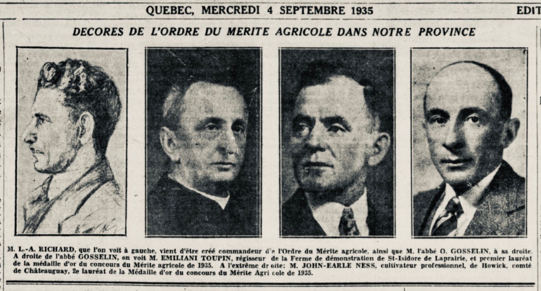 Dans L’Action catholique du 3 septembre et dans Le Soleil du lendemain, on apprend que Louis-Arthur Richard reçoit l’Ordre du mérite agricole pour pour la part qu’il a prise a l’établissement du Parc National des Laurentides et du Jardin zoologique. Instigateur de l’acquisition du Nid de l’Aigle, rappelons que son résumé de carrière est imposant. Il a étudié au Séminaire des Trois-Rivières et à I’Université Laval. Il est conseil du roi (CR) et docteur en droit. Il a été pendant dix ans secrétaire de sir Lomer Gouin et ensuite sous-ministre de la Colonisation sous MM. Perrault et Laferté; il l’est encore sous M. Vautrin à ce moment. Il a été également professeur de législation à l’École forestière. Remarquez-vous quelque chose de particulier dans le portrait de Louis-Arthur Richard, en agrandissant cette rubrique? Souvenez-vous de ses amis, dans les notes précédentes.