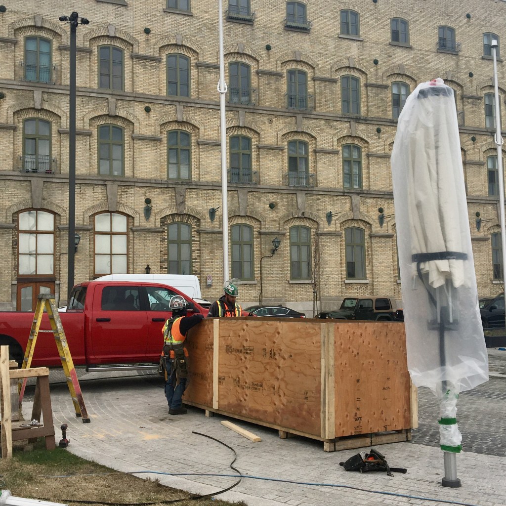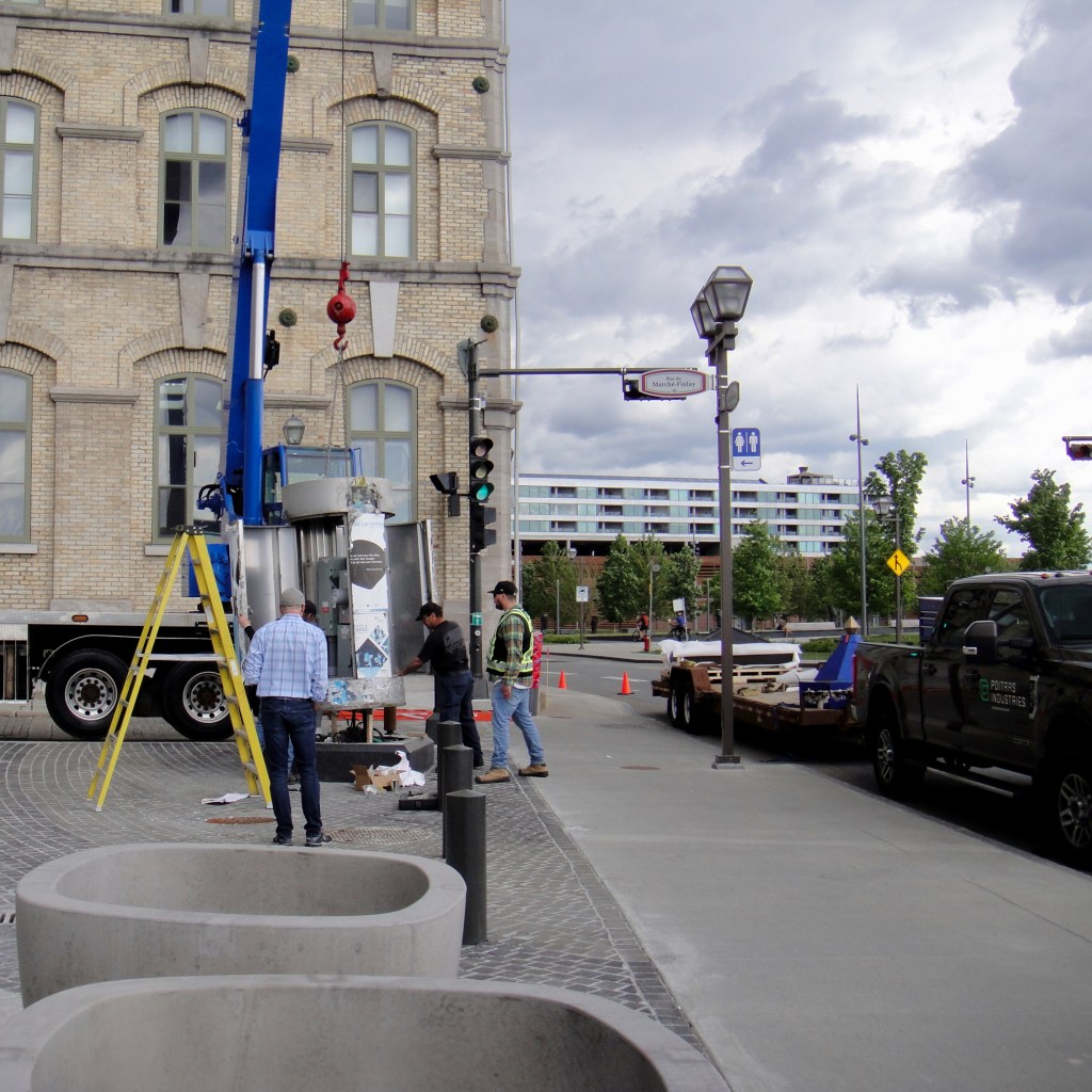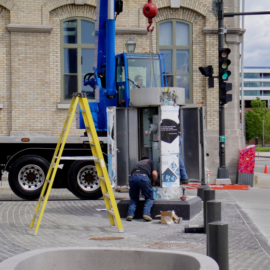 Une autre entreprise reconnue de la région est à l’œuvre aujourd’hui. Une firme de grutiers et une firme de création d’enseignes, sous la supervision du contractuel ayant contribué à la rénovation de cette future Place, sont bien occupés ce matin du 12 juin. Cette fois-ci, c’est l’ancienne tour Morris qui fait ses adieux, pour faire place à une nouvelle tour de signalisation comportant de l’information historique, selon un gestionnaire de projet qui était sur place.