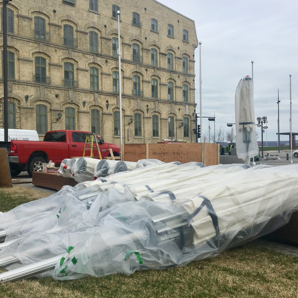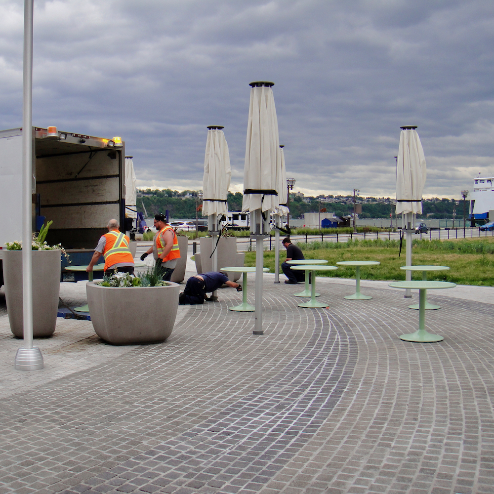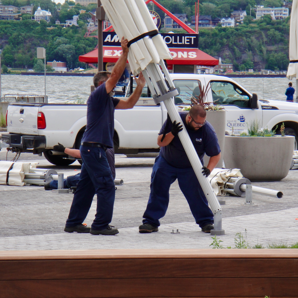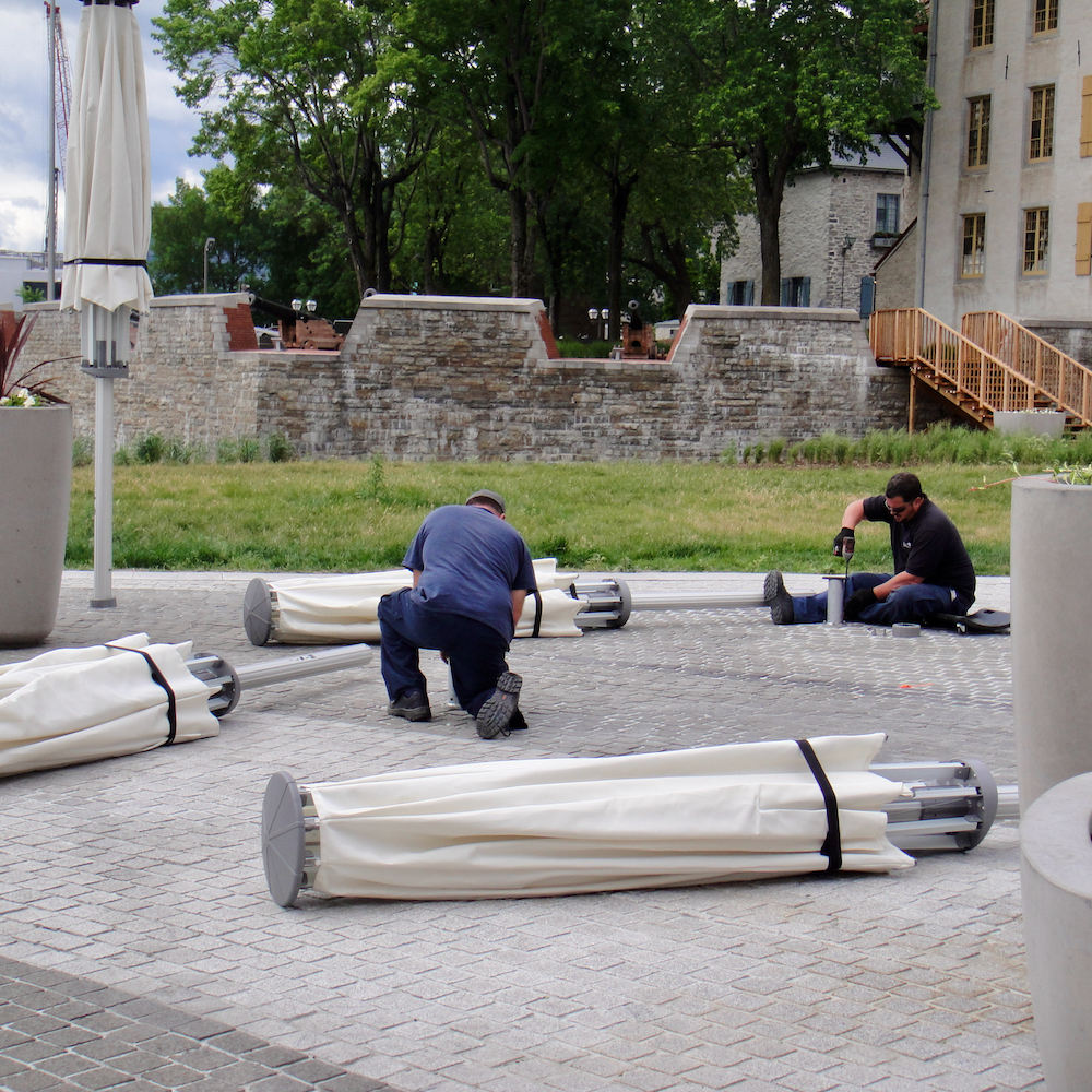 Une équipe participant au projet était sur place pendant l’avant-midi pour installer ces fameux parasols provenant de la Suisse. La « brigade des quatre », comme on pourrait l’appeler, s’est affairée à les sortir de leur caisse et à les ancrer solidement au sol, ce qui donnera enfin un cachet final à cette place. On a livré les tables et les chaises également. Les conversations enjouées et l’enthousiasme étaient aussi au rendez-vous. Merci à cette équipe qui aura contribué à rendre les lieux plus invitants!