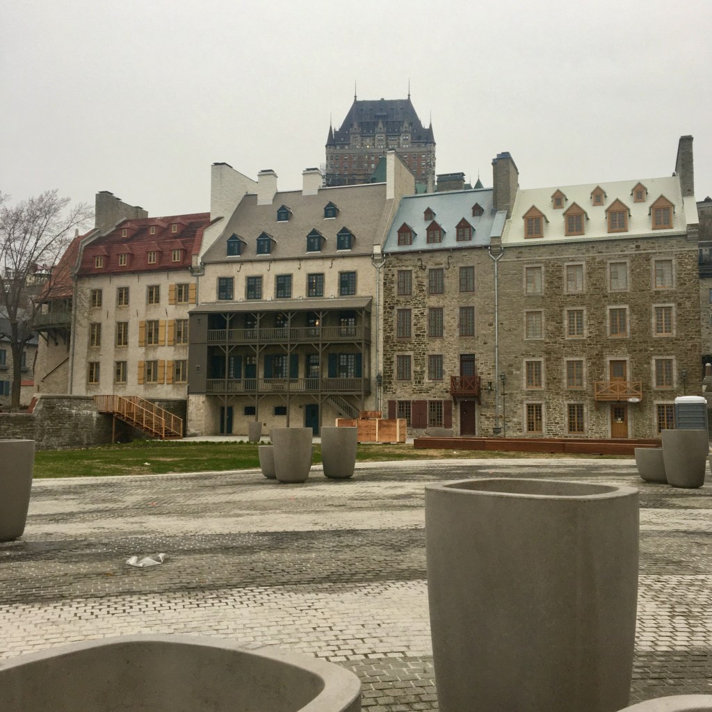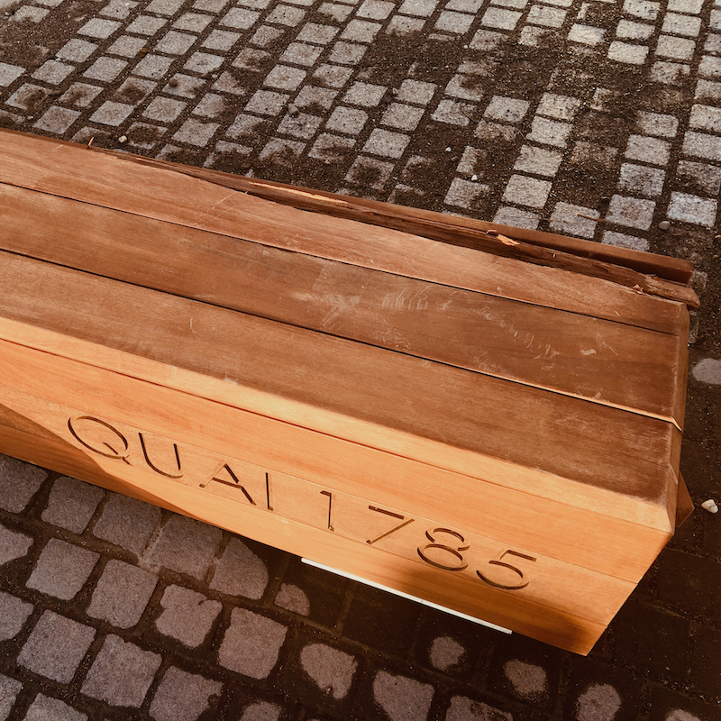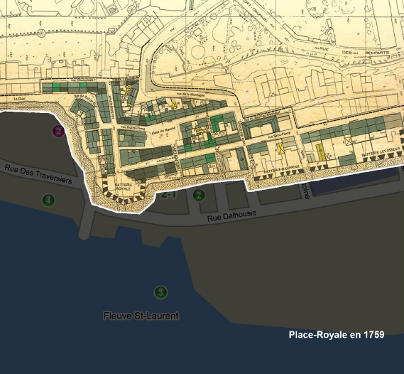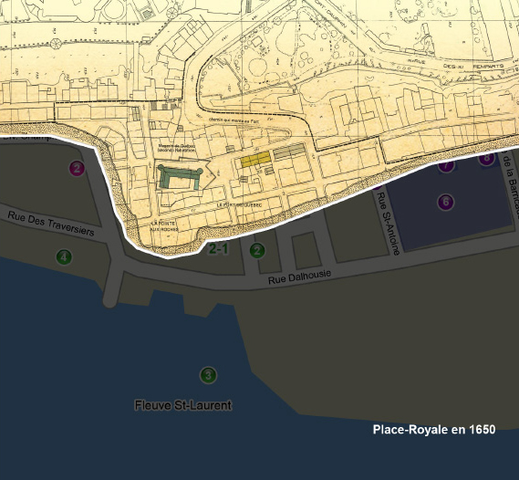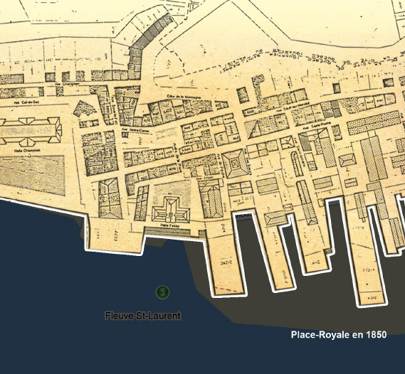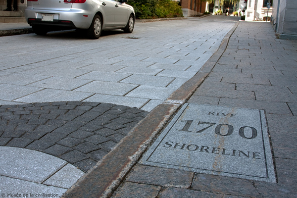 La firme ayant conçu ce nouveau parc urbain a eu l’excellente idée d’intégrer dans le mobilier une partie de l’histoire en incorporant 3 madriers qui délimitent les berges sur trois périodes, 1837 à l’avant, 1818 au milieu et 1785 en arrière; ces limites ont été établies lors de fouilles archéologiques sur les lieux. Par ailleurs, on retrouve sur le site du Musée de la Civilisation un article qui décrit l’expansion des berges à Place Royale en 1650, 1659 et 1850.