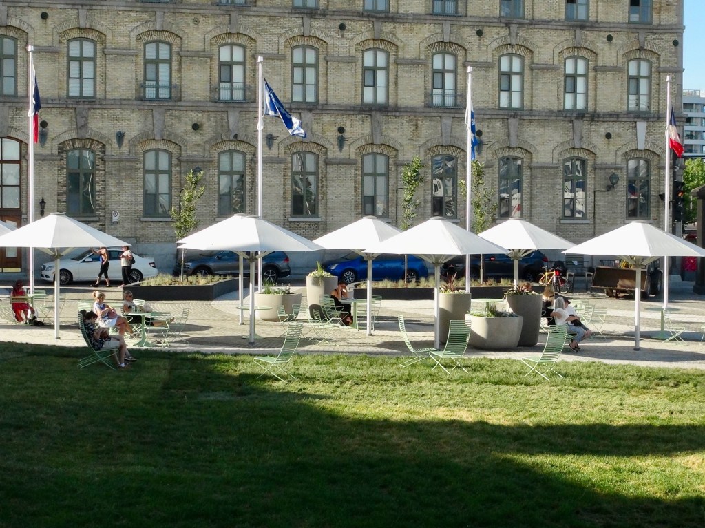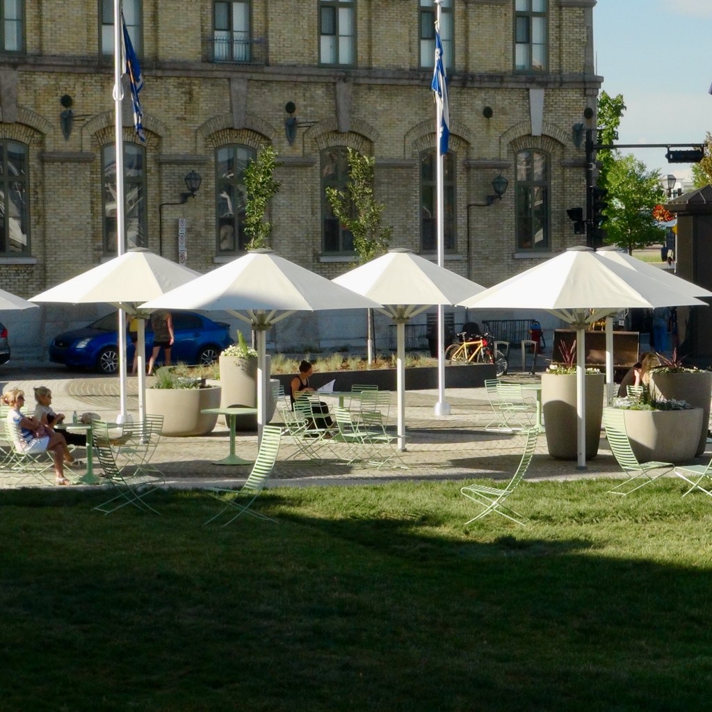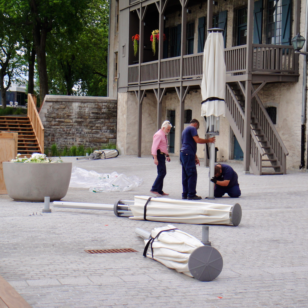 Voilà un aperçu de l’apparence de Place de Paris, pour l’été 2020. Ici, nous vous offrons en exclusivité la générale. Ces grands parasols, qui proviennent d’une firme réputée, sont garantis pour résister à des vents de haute vélocité, selon les spécifications techniques du fabricant, sélectionné judicieusement. La firme de design du parc s’est assuré de procurer à la ville une gamme de parasols fabriquée par un manufacturier de classe mondiale, la firme Glatz. Elle a sélectionné la gamme Palazzo Style, comme on peut le constater dans la fiche documentaire du produit. Quant aux urnes immenses dispersées sur la place, elles font partie de la série Larkspur, conçues par la firme Kornegay Design, des spécialistes du paysagement. En principe, ce sont deux choix judicieux en considération des rigueurs climatiques de l’endroit, semblerait-il.