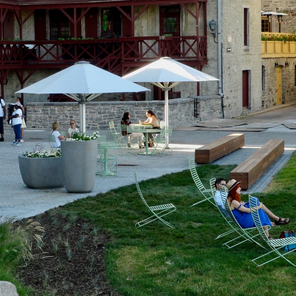 Aujourd’hui, l’équipe de projet a donné son coup de manivelle après toutes ces retouches de la semaine… élagage des arbres, touches finales sur la maçonnerie, remplacement de pelouse, toutes ces petites attentions qui se bousculent parfois en fin de projet, ce qui est le lot de bien des projets, quand on s’apprête à livrer; rien d’alarmant! Les citoyens et citoyennes font déjà partie du décor. Il semble que ce cette Place deviendra populaire, et offrira un clin d’oeil intéressant pour ceux et celles qui se promène à la Place des Canotier. Ce sera une invitation à traverser la rue Dalhousie. Voici donc quelques clichés pris à l’improviste, en fin d’après-midi qui en font un portrait vivant. L’attente fait place à l’émerveillement. Il suffit de tendre l’oreille pour entendre des ohs et des ahs! Bon début et merci à tous ceux et celles qui on concrétisé ce qui a commencé sur une planche à dessin il y a quelques années, rappelons nous!
