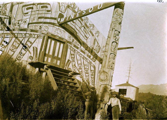 Chaque photo de l’album Pinterest ci-dessus mériterait un commentaire. Voici deux exemples particuliers qui peuvent retenir notre attention. Comme il a été démontré dans la note « La route des totems vers l’Alaska …« , les croisiéristes affluent dans cette région pour admirer les mâts totémiques. Le temps a fait ses ravages habituels, mais le témoignage persistant de ces clichés réalisés avec des appareils photographiques utilisant de très grands négatifs nous replonge dans l’ambiance unique de cette époque révolue. Le premier cliché d’Edward Dossetter illustre bien comment les mâts font partie du paysage à cette époque; le photographe accompagnait un inspecteur du gouvernement lors d’une lors d’une tournée d’inspection. Le second cliché de Robert W. Wilson est un exemple typique de l’alignement des maisons sur les rivages; en plus, on a droit à un ego portrait comme on en voit de nos jours.