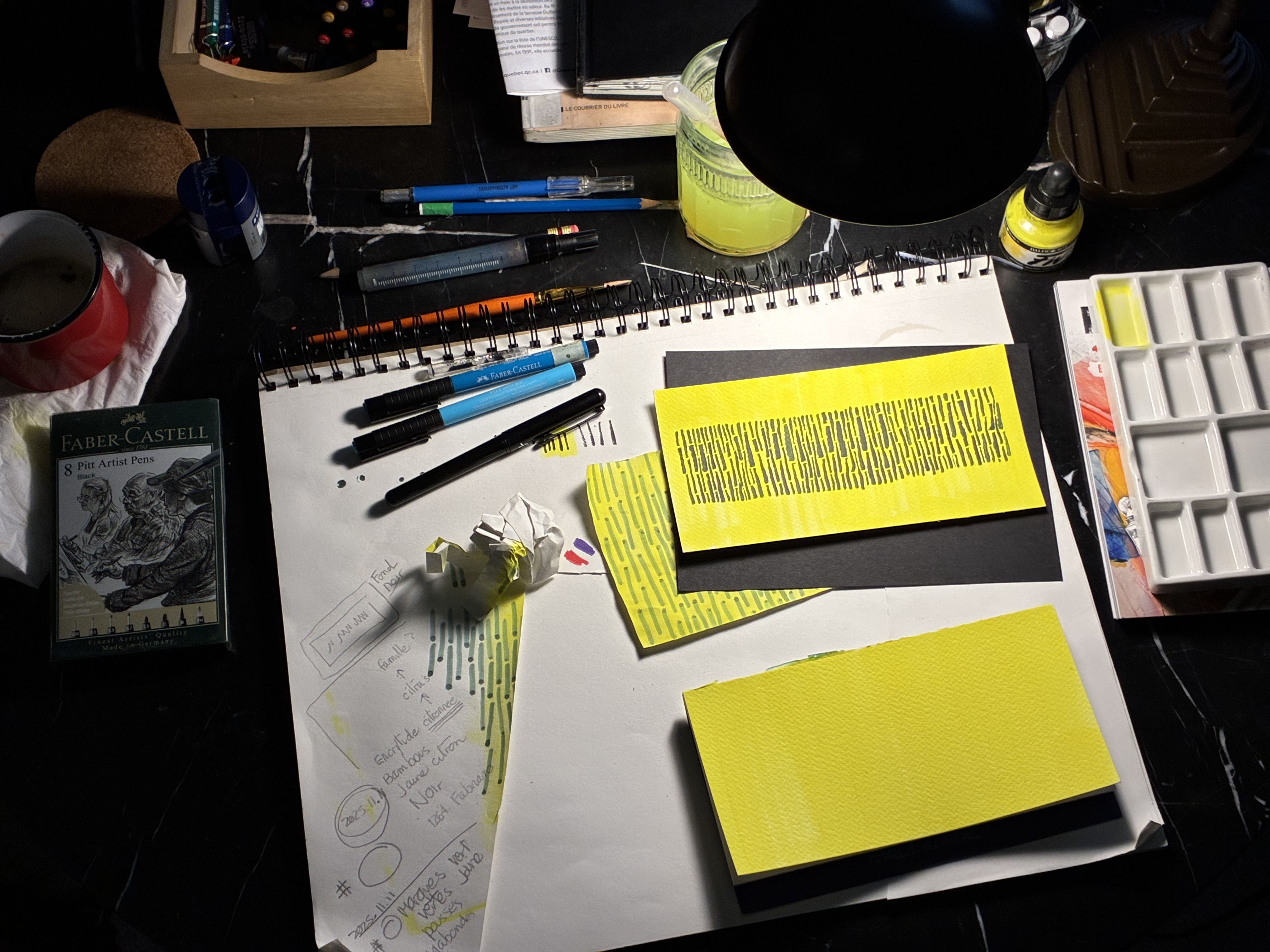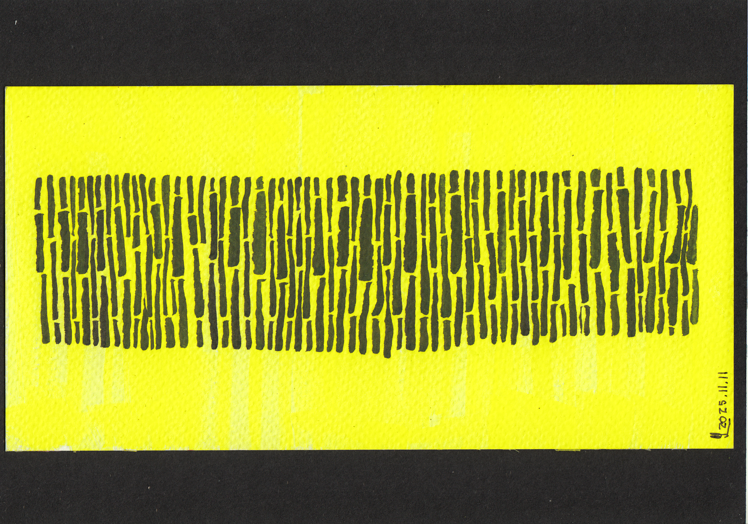 Improbable code-barres citron – Encre noire à pigments Pentel sur fond encre Daler Rowney jaune citron. Papier aquarelle Fabriano 1264 sur fond papier Clairefontaine Paint On multitechniques noior.