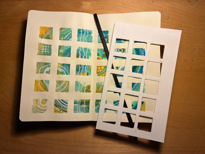 Les deux journaux créatifs dans lesquels je travaille couramment s’accompagnent de deux gabarits en carton que je conserve en dernière page pour effectuer des mises en page intéressantes. Mes premières grilles – des essais sur la couleur – remontent à la mi-novembre.