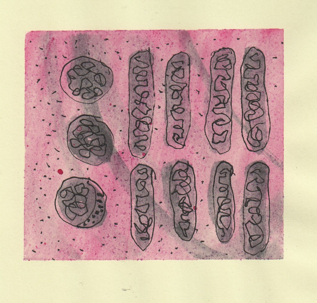 Dans le cas ci dessus, j’ai intégré cette petite caricature tracée en vitesse sur la table pour présenter cette série de 10 aquarelles miniatures qui pourraient être des observations au microscope de ce professeur un peu dingue qui cherche on ne sait quoi dans les pigments d’aquarelle qui lui passent sous le nez!