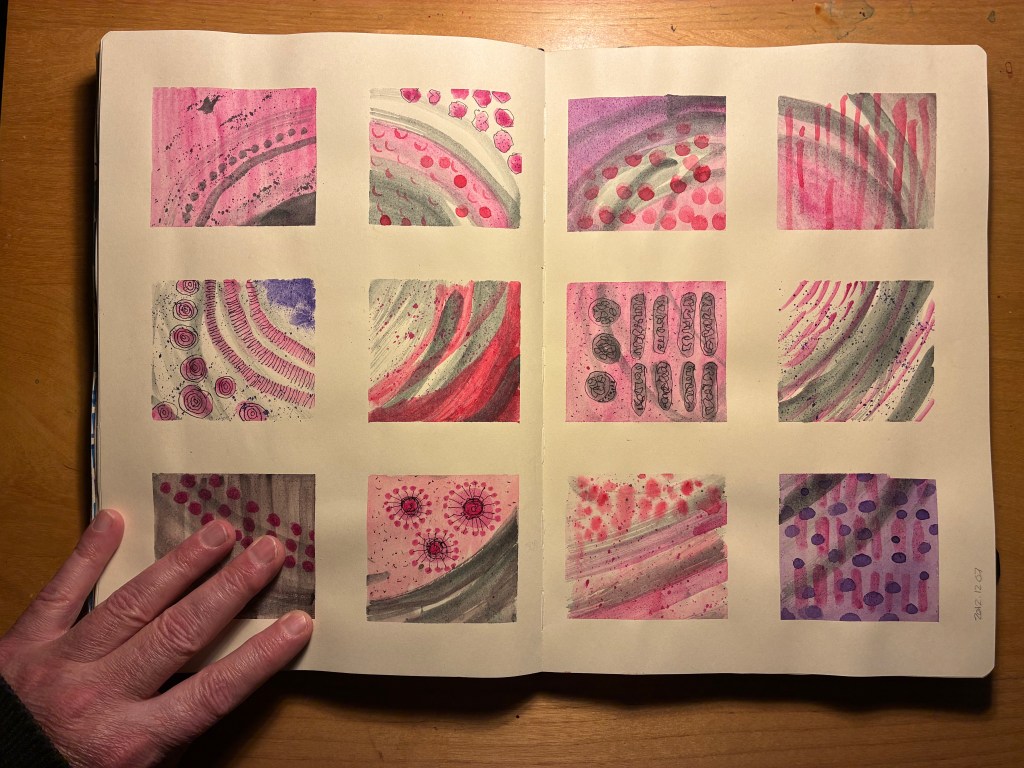 Cette idée de créer des miniatures dans mon journal s’inscrit dans mon habitude d’utiliser une grille dont je délimite les carrés par du ruban cache, ce qui permet de travailler toutes les tuiles comme si c’était un seul tableau. Par la suite, je peux intervenir sur des parties individuelles pour ajouter de la variation et de la diversité… Voilà donc à quoi a l’air ce journal, sur lequel on voit ces deux grands mouvements circulaires tracés avec du gris et du rose. On continue ensuite d’enrichir chaque carré et, à la fin, on détache très délicatement le ruban à masquer ; c’est comme une surprise. C’est une technique très efficace pour éviter l’angoisse de la page blanche.